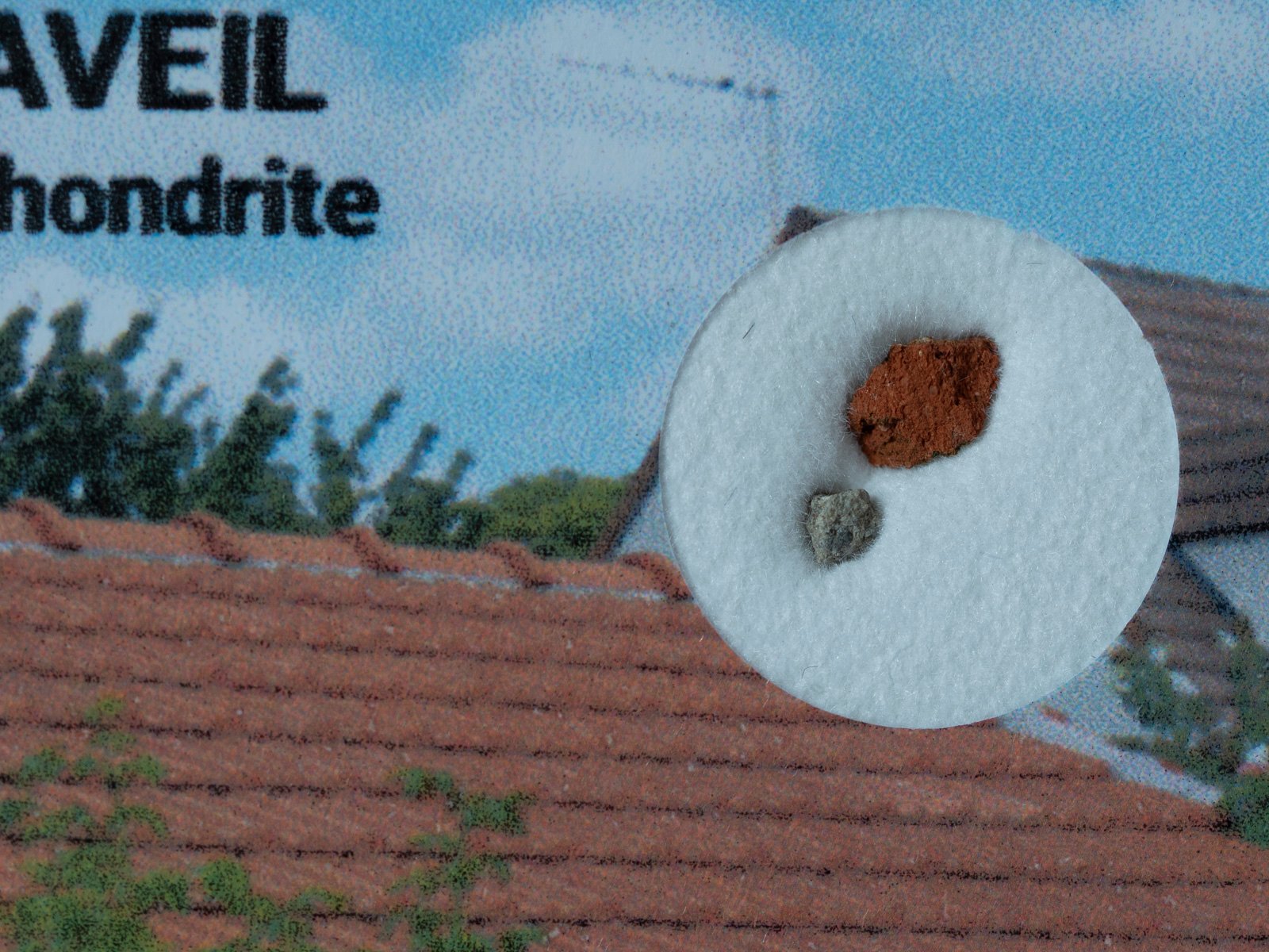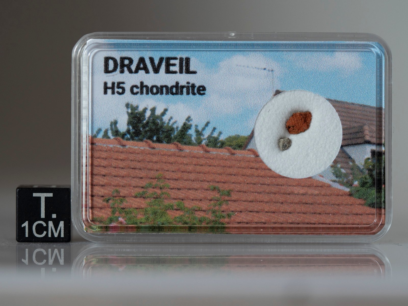 History: A 206 g stone was found in a roof in Draveil on July 13, 2011, by N. and J.-P. Eydens and reported to P.-M. Pelé and A. Jambon (UPVI) a few days after the event. It was later discovered that a 5.2 kg stone had been seen to fall in a garden by a mailman in Savigny sur Orge at 12:30 am (local time) on that same day. Two more stones (88 g and 2 kg) made holes and dents in roofs in Draveil and Grigny, and a fifth one was later found by two schoolgirls in the park of the Rosa Parks high school in Montgeron. One was reported to have crashed through the windshield of a car in Draveil.
