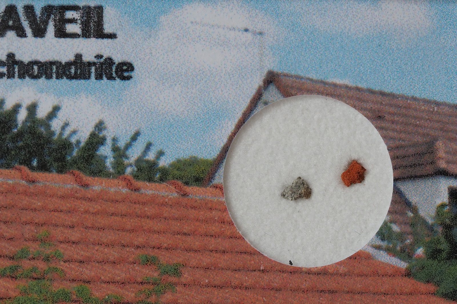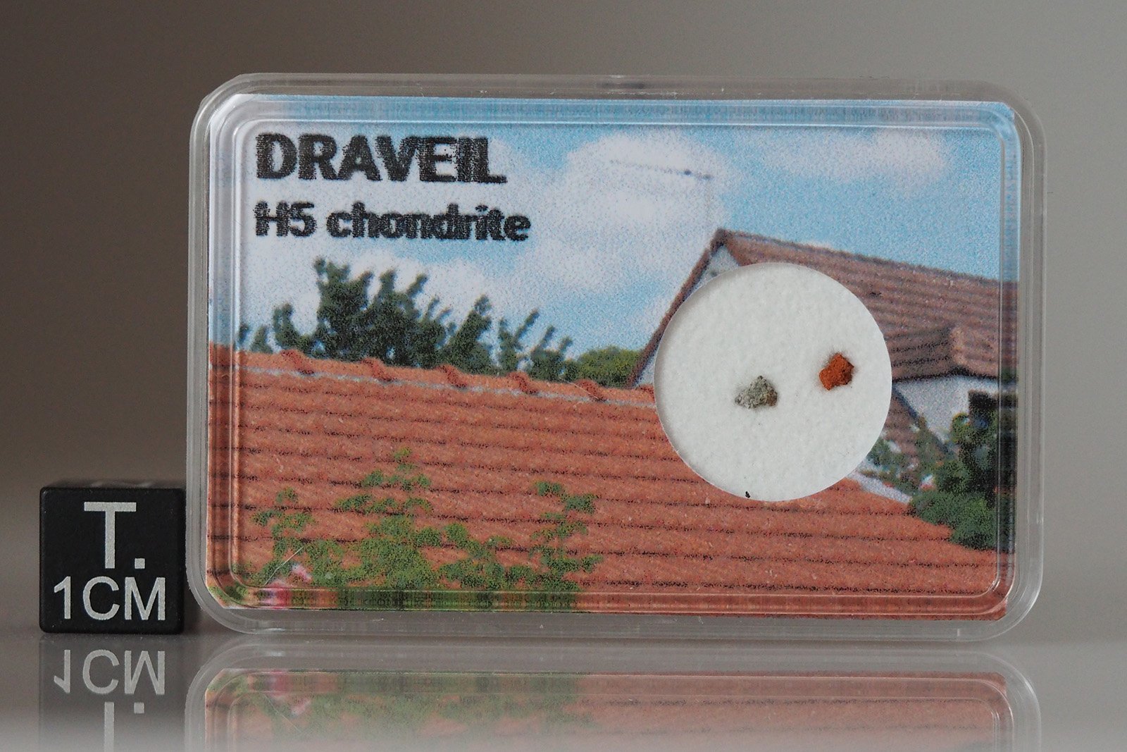 History: A 206 g stone was found in a roof in Draveil on July 13, 2011, by N. and J.-P. Eydens and reported to P.-M. Pelé and A. Jambon (UPVI) a few days after the event. It was later discovered that a 5.2 kg stone had been seen to fall in a garden by a mailman in Savigny sur Orge at 12:30 am (local time) on that same day. Two more stones (88 g and 2 kg) made holes and dents in roofs in Draveil and Grigny, and a fifth one was later found by two schoolgirls in the park of the Rosa Parks high school in Montgeron. One was reported to have crashed through the windshield of a car in Draveil.