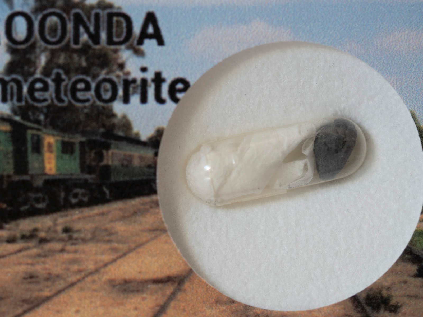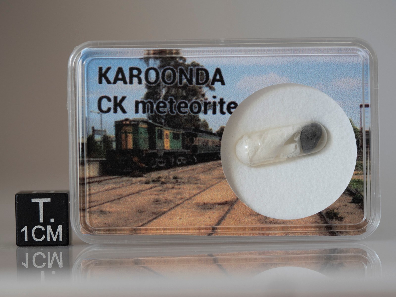 The Karoonda meteorite fell to earth on 25 November 1930 at 10:53 pm near the South Australian town of Karoonda. The CK chondrites were named for this meteorite. Adelaide residents reported a huge ball of fire with a flaming tail shooting across the eastern sky. Some reported that the colour of the flames changed from brilliant red, to pale blue to sickly yellow. Witnesses closer to Karoonda reported that a loud detonation followed by a low rumbling like thunder was heard shortly after the meteorite passed overhead. The meteorite was eventually found nearly a month later by Professor Kerr Grant who collected information from locals and then searched an area of radius 3 miles (5 km). The remains of the object were found about 2 feet (0.6 m) underground, in a crater about 2 feet (0.6 m) in diameter. Total mass found was 41.73 kg.