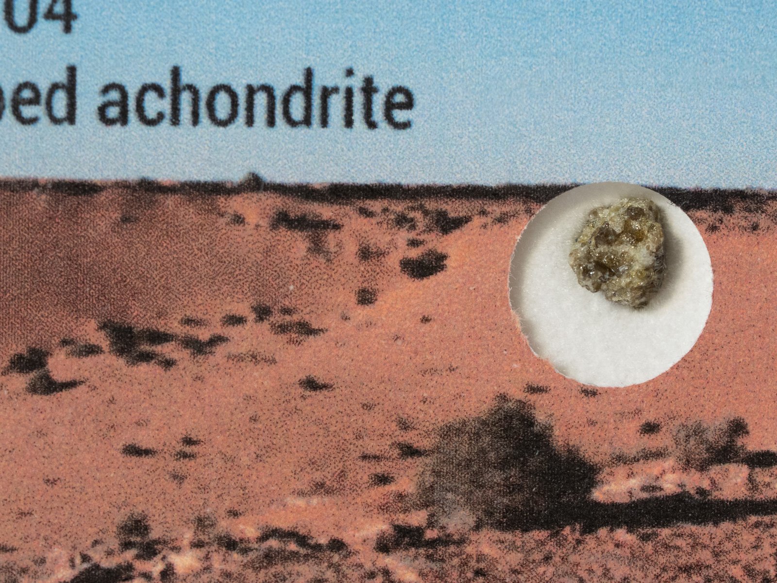 Physical characteristics: The reassembled 42 pieces (plus some granular debris) fit together as a single ovoid mass (8387 g) with rounded, shiny exterior surfaces and small patches of remnant black fusion crust. The very fresh interior is mostly pale yellowish green with sporadic darker brownish grains and sparsely distributed tiny grains of opaque oxide and silvery metal.