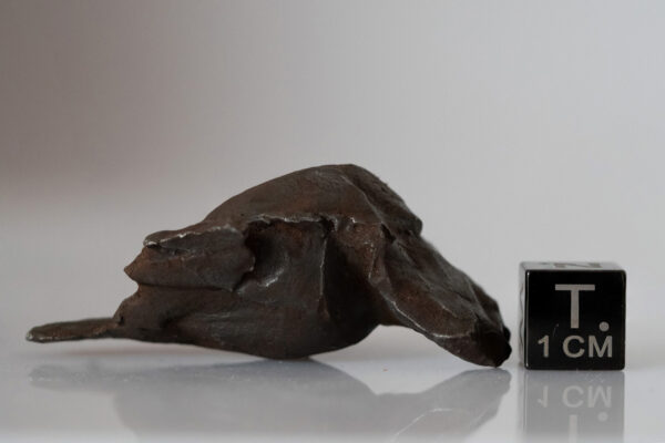 Physical characteristics: A 634 g type specimen, measuring 88 × 70 × 55 mm, is flattened and jagged shrapnel with a rough, dark-brown external surface. The surface originally sitting in the desert soil shows some oxy-hydroxides due to terrestrial weathering.