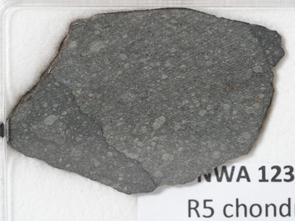 Physical characteristics: Dark stone, partially covered with fusion crust. Cut surface reveals dark interior with small chondrules.