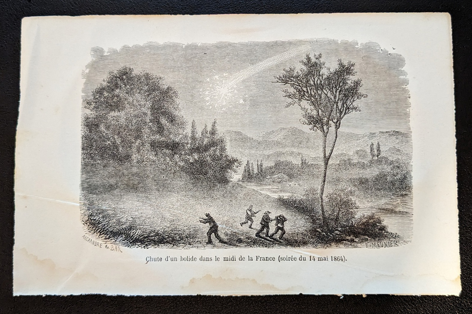 Engraving of the Orgueil meteorite fall in 1864. Engraving is extracted from 1866 book by Louis Figuier.