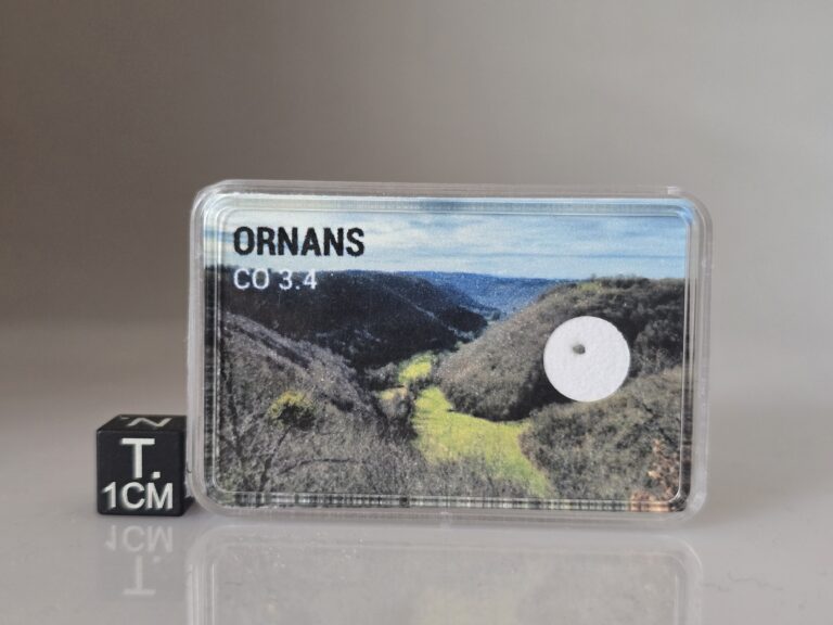 It is interesting to note that the meteorite of Ornans paradoxically looks like very few other members of its class! It has a color matrix of a “gray mouse” instead of a deeper black color commonly encountered in others CO. It is also very porous – “it nevertheless absorbed up to a tenth of its weight in water,” according to the report of the Academy of Sciences -, where other carbonacrous chondrites are more compact and solid. Very friable, the meteorite of Ornans is easily reduced to powder, lightly gripped between the fingers. Prudence therefore. I advise you to keep it in a membrane box (boxes that can be purchased on the mineral fairs or online.