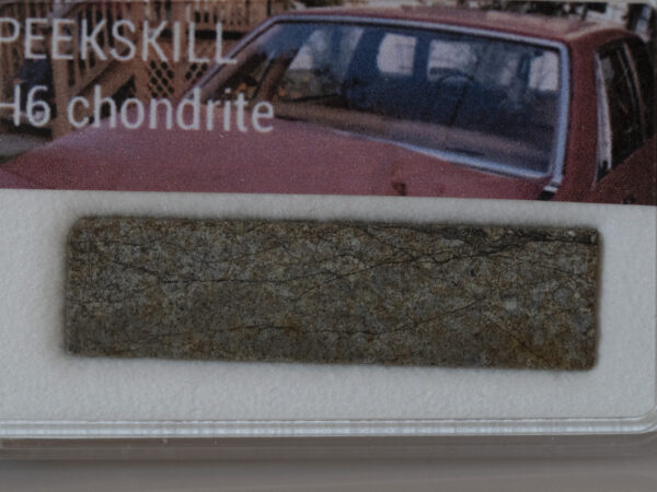 After a fireball and loud noise a stone fell on Michelle Knapp’s car, parked before her house at 207 Wells Street, Peekskill. A stone of 12,370 g and about 200 g in fragments were recovered. Information, classification and analysis, olivine Fa20, pyroxene Fs17, light, cm-sized H6 clasts in darker H6 matrix, Ignacio Casanova, Department of Geology, Field Museum of Natural History, Roosevelt Road at Lake Shore Drive, Chicago, Illinois 60605-2496, USA. The main mass is in the hand of private collectors: 5.2 kg, Ray Meyer; 1.2 kg, Jim Schwade; 1 kg, Marlin Cilz; 470 g, Field Museum.